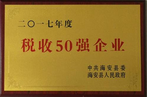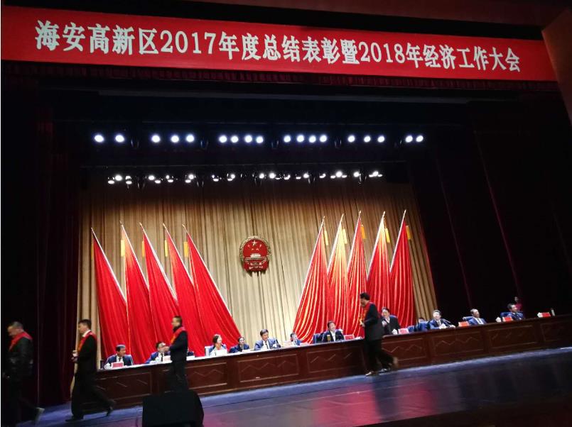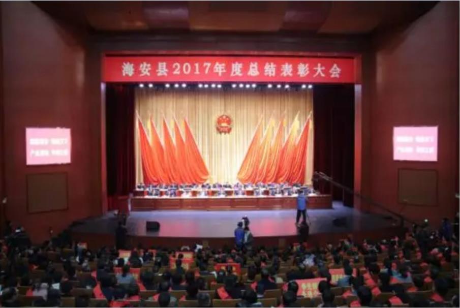 2018年2月23日,中共海安縣委員會(huì)、海安縣人民政府在海安縣文化藝術(shù)中心召開(kāi)“海安縣2017年度總結(jié)表彰大會(huì)”。會(huì)上,公司被縣委、縣政府表彰為“稅收50強(qiáng)企業(yè)”、“工業(yè)百?gòu)?qiáng)企業(yè)”。公司董事長(zhǎng)梅超華同志榮膺“四星級(jí)企業(yè)家”稱號(hào)。 縣委、縣鎮(zhèn)府表彰大會(huì)現(xiàn)